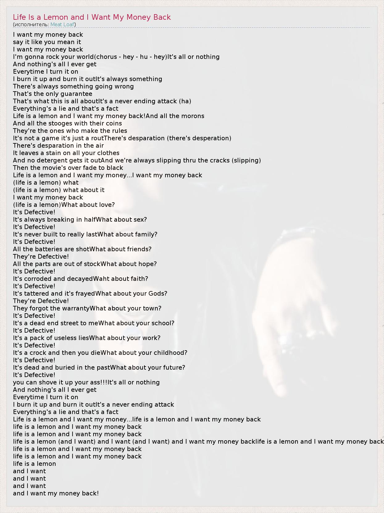 ГлавнаяИсполнителиMeat LoafLife Is a Lemon and I Want My Money Back
