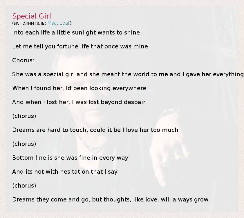 Это интересно:Мясной рулет, в оригинале meat loaf, - так по доброте душевной называл Марвина Ли Эдея (Marvin Lee Aday) его школьный тренер по футболу. Большой, неуклюжий, грузный, на футбольном поле Марвин вызывал скорее сочувствие и, в общем-то, вполне заслуживал такого нелестного прозвища. Через каких-нибудь 10-15 лет "Мясной рулет" прославится на весь мир, запишет мировой бестселлер "Bat out of Hell", станет рекордсменом... продолжение