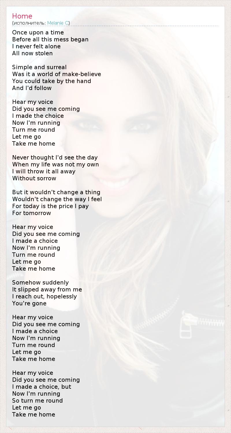Once upon a time Before all this mess began I never felt alone All now stolen Simple and surreal Was it a world of make-believe You could take by the hand And I'd follow Hear my voice Did you see me coming I made the choice Now I'm running Turn me round Let me go Take me home Never thought I'd see the day When my life was not my own I will throw it all away Without sorrow But it wouldn't change a thing Wouldn't change the way I feel For today is the price I pay For tomorrow Hear my voice Did you see me coming I made a choice Now I'm running Turn me round Let me go Take me home Somehow suddenly It slipped away from me I reach out, hopelessly You're gone Hear my voice Did you see me coming I made a choice Now I'm running Turn me round Let me go Take me home Hear my voice Did you see me coming I made a choice, but Now I'm running So turn me round Let me go Take me home