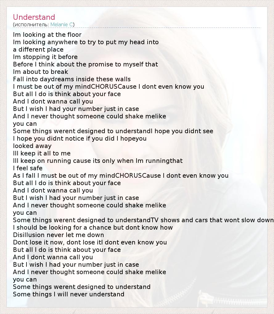 Im looking at the floor Im looking anywhere to try to put my head into a different place Im stopping it before Before I think about the promise to myself that Im about to break Fall into daydreams inside these walls I must be out of my mindCHORUSCause I dont even know you But all I do is think about your face And I dont wanna call you But I wish I had your number just in case And I never thought someone could shake melike you can Some things werent designed to understandI hope you didnt see I hope you didnt notice if you did I hopeyou looked away Ill keep it all to me Ill keep on running cause its only when Im runningthat I feel safe As I fall I must be out of my mindCHORUSCause I dont even know you But all I do is think about your face And I dont wanna call you But I wish I had your number just in case And I never thought someone could shake melike you can Some things werent designed to understandTV shows and cars that wont slow down I should be looking for a chance but dont know how Disillusion never let me down Dont lose it now, dont lose itI dont even know you But all I do is think about your face And I dont wanna call you But I wish I had your number just in case And I never thought someone could shake melike you can Some things werent designed to understand Some things I will never understand