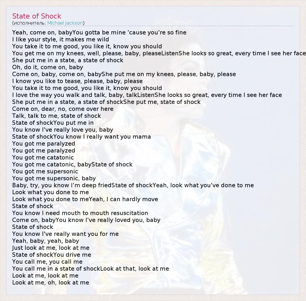 Yeah, come on, babyYou gotta be mine 'cause you're so fine I like your style, it makes me wild You take it to me good, you like it, know you should You get me on my knees, well, please, baby, pleaseListenShe looks so great, every time I see her face She put me in a state, a state of shock Oh, do it, come on, baby Come on, baby, come on, babyShe put me on my knees, please, baby, please I know you like to tease, please, baby, please You take it to me good, you like it, know you should I love the way you walk and talk, baby, talkListenShe looks so great, every time I see her face She put me in a state, a state of shockShe put me, state of shock Come on, dear, no, come over here Talk, talk to me, state of shock State of shockYou put me in You know I've really love you, baby State of shockYou know I really want you mama You got me paralyzed You got me paralyzed You got me catatonic You got me catatonic, babyState of shock You got me supersonic You got me supersonic, baby Baby, try, you know I'm deep friedState of shockYeah, look what you've done to me Look what you done to me Look what you done to meYeah, I can hardly move State of shock You know I need mouth to mouth resuscitation Come on, babyYou know I've really loved you, baby State of shock You know I've really want you for me Yeah, baby, yeah, baby Just look at me, look at me State of shockYou drive me You call me, you call me You call me in a state of shockLook at that, look at me Look at me, look at me Look at me, oh, look at me