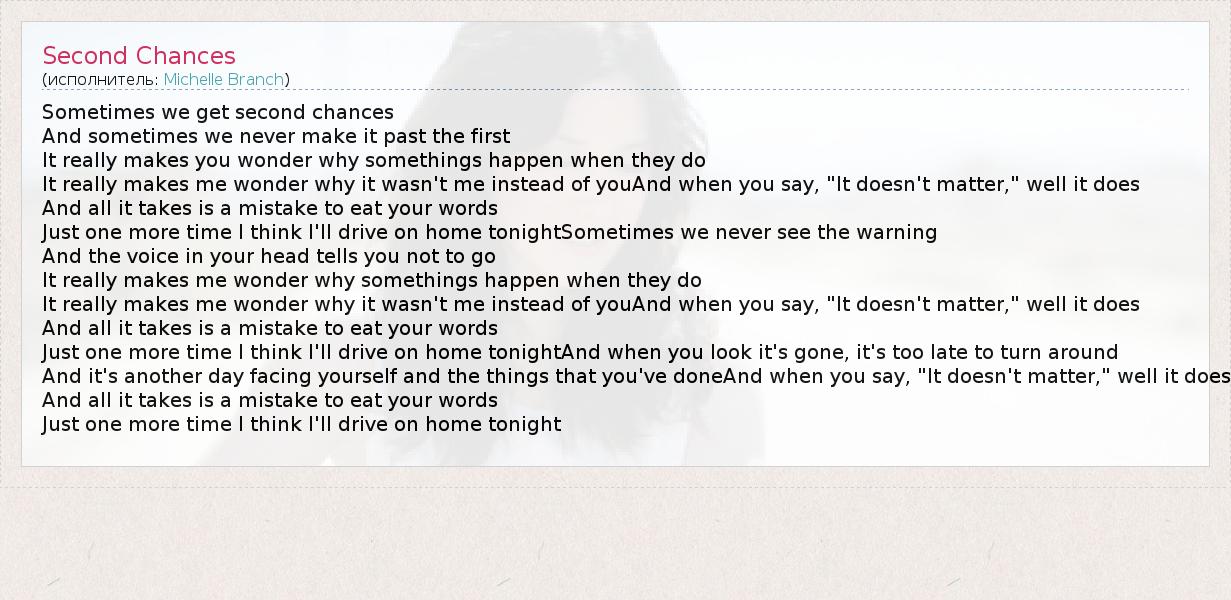 Это интересно:Мишель Бранч (англ. Michelle Branch, род. 2 июля 1983) — американская певица и гитаристка, лауреат премии «Грэмми» 2003 года за песню «The Game of Love», записанную совместно с Карлосом Сантаной. В начале 2000-х Бранч выпустила два успешных альбома — The Spirit Room и Hotel Paper, а также несколько синглов, которые положили начало её музыкальной карьере. В 2003 году была номинирована на премию «Грэмми» в номинации лучший... продолжение