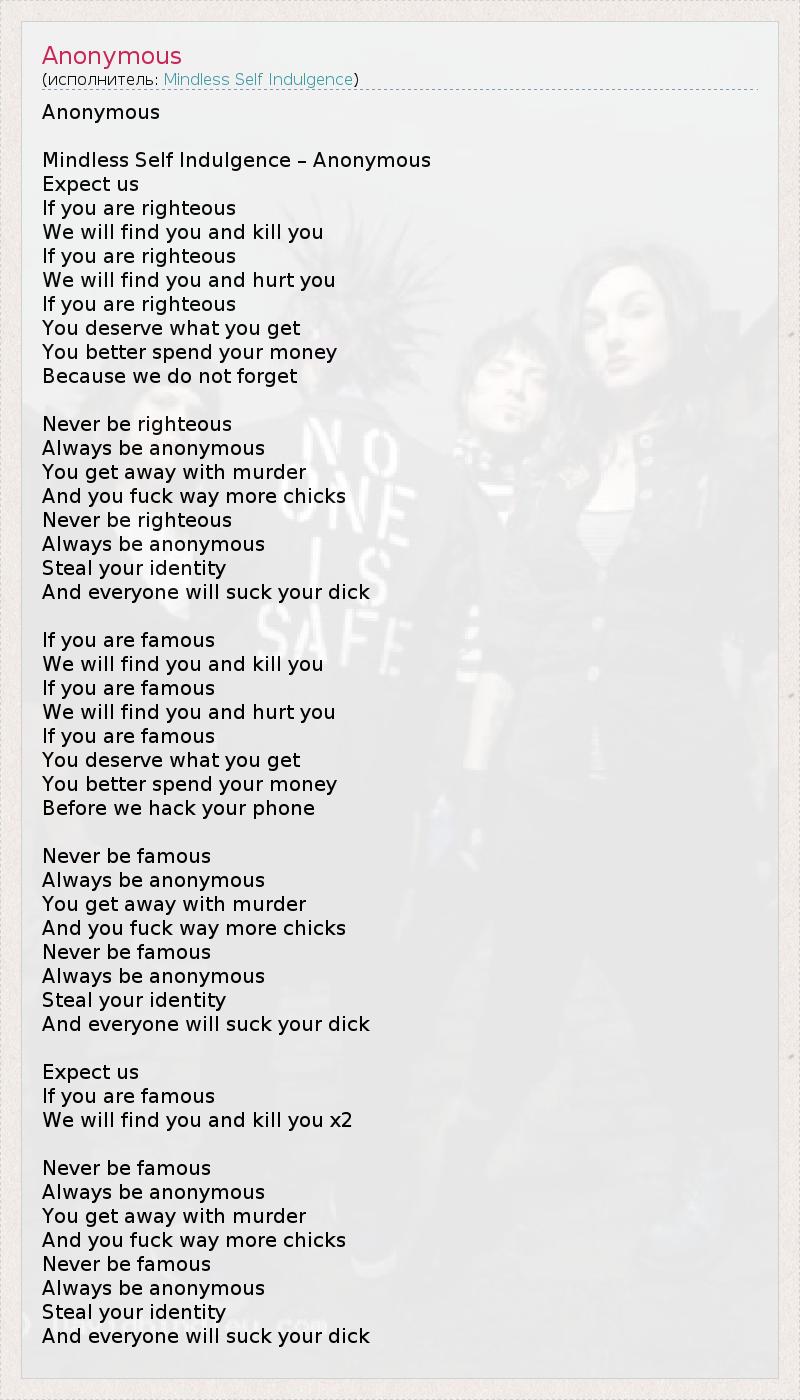 Anonymous Mindless Self Indulgence – Anonymous Expect us If you are righteous We will find you and kill you If you are righteous We will find you and hurt you If you are righteous You deserve what you get You better spend your money Because we do not forget Never be righteous Always be anonymous You get away with murder And you fuck way more chicks Never be righteous Always be anonymous Steal your identity And everyone will suck your dick If you are famous We will find you and kill you If you are famous We will find you and hurt you If you are famous You deserve what you get You better spend your money Before we hack your phone Never be famous Always be anonymous You get away with murder And you fuck way more chicks Never be famous Always be anonymous Steal your identity And everyone will suck your dick Expect us If you are famous We will find you and kill you x2 Never be famous Always be anonymous You get away with murder And you fuck way more chicks Never be famous Always be anonymous Steal your identity And everyone will suck your dick