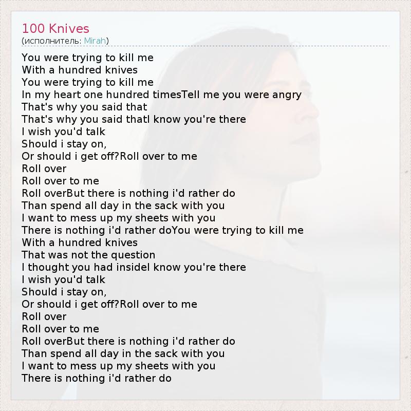 You were trying to kill me With a hundred knives You were trying to kill me In my heart one hundred timesTell me you were angry That's why you said that That's why you said thatI know you're there I wish you'd talk Should i stay on, Or should i get off?Roll over to me Roll over Roll over to me Roll overBut there is nothing i'd rather do Than spend all day in the sack with you I want to mess up my sheets with you There is nothing i'd rather doYou were trying to kill me With a hundred knives That was not the question I thought you had insideI know you're there I wish you'd talk Should i stay on, Or should i get off?Roll over to me Roll over Roll over to me Roll overBut there is nothing i'd rather do Than spend all day in the sack with you I want to mess up my sheets with you There is nothing i'd rather do