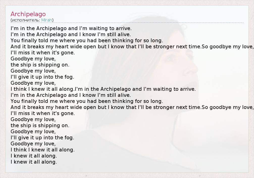 I'm in the Archipelago and I'm waiting to arrive. I'm in the Archipelago and I know I'm still alive. You finally told me where you had been thinking for so long. And it breaks my heart wide open but I know that I'll be stronger next time.So goodbye my love, I'll miss it when it's gone. Goodbye my love, the ship is shipping on. Goodbye my love, I'll give it up into the fog. Goodbye my love, I think I knew it all along.I'm in the Archipelago and I'm waiting to arrive. I'm in the Archipelago and I know I'm still alive. You finally told me where you had been thinking for so long. And it breaks my heart wide open but I know that I'll be stronger next time.So goodbye my love, I'll miss it when it's gone. Goodbye my love, the ship is shipping on. Goodbye my love, I'll give it up into the fog. Goodbye my love, I think I knew it all along. I knew it all along. I knew it all along.
