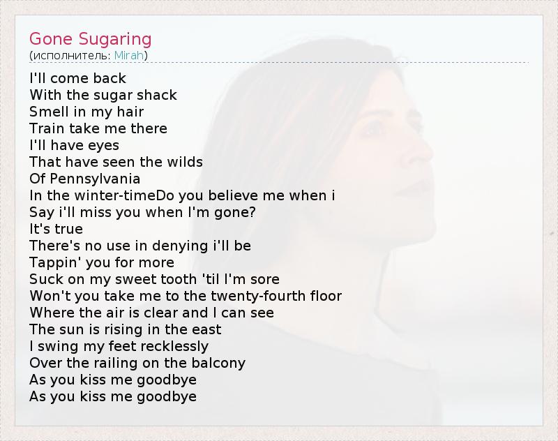 I'll come back With the sugar shack Smell in my hair Train take me there I'll have eyes That have seen the wilds Of Pennsylvania In the winter-timeDo you believe me when i Say i'll miss you when I'm gone? It's true There's no use in denying i'll be Tappin' you for more Suck on my sweet tooth 'til I'm sore Won't you take me to the twenty-fourth floor Where the air is clear and I can see The sun is rising in the east I swing my feet recklessly Over the railing on the balcony As you kiss me goodbye As you kiss me goodbye