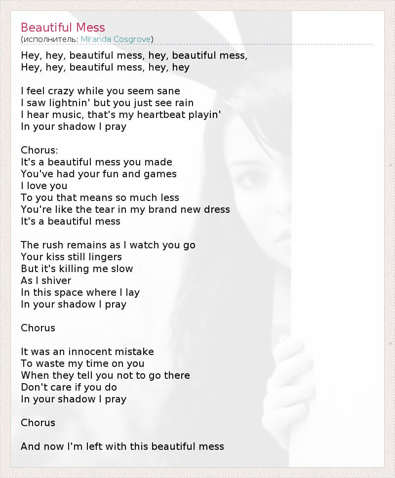 Эй, эй, прекрасный беспорядок, эй, прекрасный беспорядок, Эй, эй, прекрасный беспорядок, эй, эй Я чувствую, что сошла с ума, тогда как ты кажешься нормальным, Я увидела молнию, но ты видишь только дождь, Я слышу музыку, это - биение моего сердца, В твоей тени я молюсь Припев: Это прекрасный беспорядок, который ты сотворил, У тебя свои забавы и игры, Я люблю тебя, Тебя волнует это меньше всего, Ты как дырка на моем новом платье, Это прекрасный беспорядок Когда ты проходишь, я все так же на взводе, Твой поцелуй все еще со мной, Но он медленно меня убивает, И я дрожу, Лежа здесь, В твоей тени я молюсь Припев Это было простой ошибкой - Потратить впустую свое время на тебя, Когда тебе говорят не делать этого, Тебя это не волнует, В твоей тени я молюсь Припев И теперь я осталась с этим прекрасным беспорядком