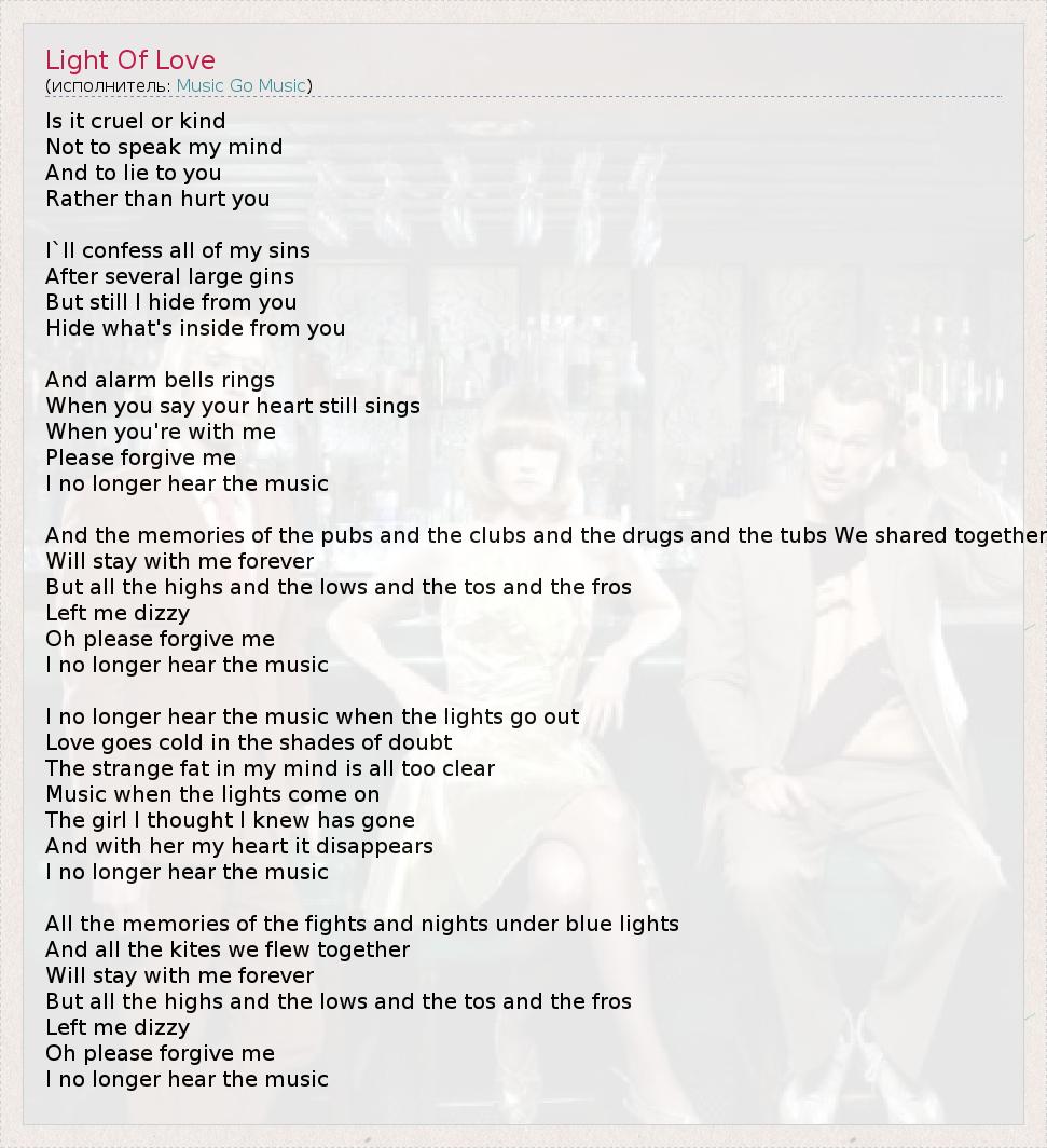 Is it cruel or kind Not to speak my mind And to lie to you Rather than hurt you I`ll confess all of my sins After several large gins But still I hide from you Hide what's inside from you And alarm bells rings When you say your heart still sings When you're with me Please forgive me I no longer hear the music And the memories of the pubs and the clubs and the drugs and the tubs We shared together Will stay with me forever But all the highs and the lows and the tos and the fros Left me dizzy Oh please forgive me I no longer hear the music I no longer hear the music when the lights go out Love goes cold in the shades of doubt The strange fat in my mind is all too clear Music when the lights come on The girl I thought I knew has gone And with her my heart it disappears I no longer hear the music All the memories of the fights and nights under blue lights And all the kites we flew together Will stay with me forever But all the highs and the lows and the tos and the fros Left me dizzy Oh please forgive me I no longer hear the music