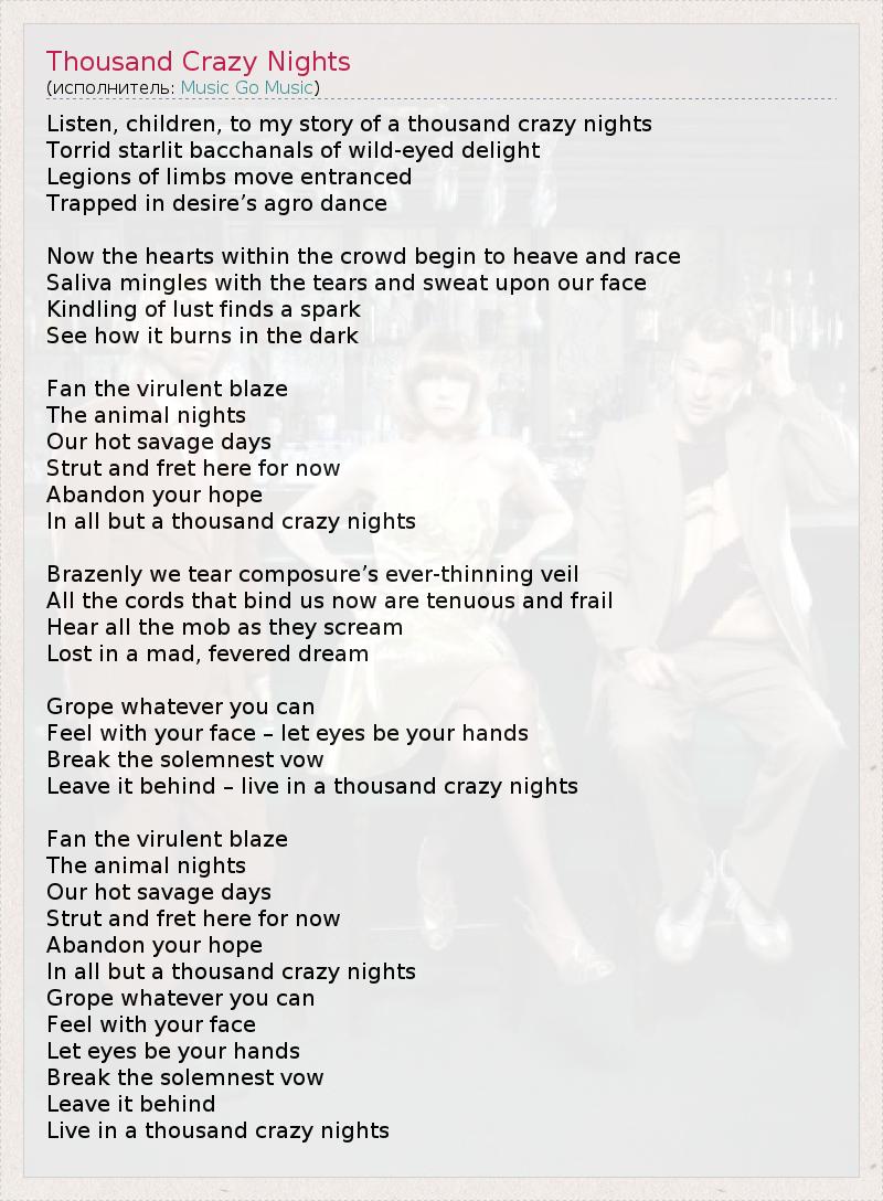 Listen, children, to my story of a thousand crazy nights Torrid starlit bacchanals of wild-eyed delight Legions of limbs move entranced Trapped in desire’s agro dance Now the hearts within the crowd begin to heave and race Saliva mingles with the tears and sweat upon our face Kindling of lust finds a spark See how it burns in the dark Fan the virulent blaze The animal nights Our hot savage days Strut and fret here for now Abandon your hope In all but a thousand crazy nights Brazenly we tear composure’s ever-thinning veil All the cords that bind us now are tenuous and frail Hear all the mob as they scream Lost in a mad, fevered dream Grope whatever you can Feel with your face – let eyes be your hands Break the solemnest vow Leave it behind – live in a thousand crazy nights Fan the virulent blaze The animal nights Our hot savage days Strut and fret here for now Abandon your hope In all but a thousand crazy nights Grope whatever you can Feel with your face Let eyes be your hands Break the solemnest vow Leave it behind Live in a thousand crazy nights