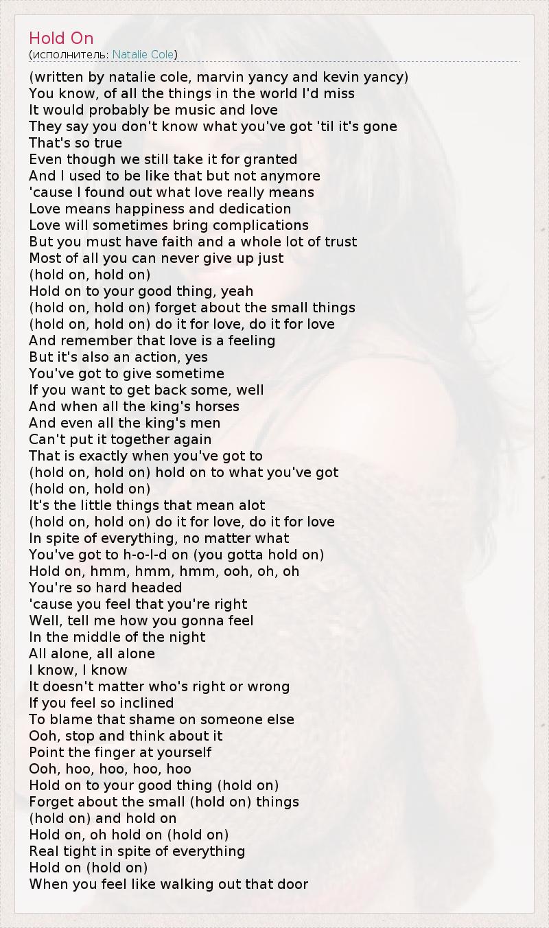 (written by natalie cole, marvin yancy and kevin yancy) You know, of all the things in the world I'd miss It would probably be music and love They say you don't know what you've got 'til it's gone That's so true Even though we still take it for granted And I used to be like that but not anymore 'cause I found out what love really means Love means happiness and dedication Love will sometimes bring complications But you must have faith and a whole lot of trust Most of all you can never give up just (hold on, hold on) Hold on to your good thing, yeah (hold on, hold on) forget about the small things (hold on, hold on) do it for love, do it for love And remember that love is a feeling But it's also an action, yes You've got to give sometime If you want to get back some, well And when all the king's horses And even all the king's men Can't put it together again That is exactly when you've got to (hold on, hold on) hold on to what you've got (hold on, hold on) It's the little things that mean alot (hold on, hold on) do it for love, do it for love In spite of everything, no matter what You've got to h-o-l-d on (you gotta hold on) Hold on, hmm, hmm, hmm, ooh, oh, oh You're so hard headed 'cause you feel that you're right Well, tell me how you gonna feel In the middle of the night All alone, all alone I know, I know It doesn't matter who's right or wrong If you feel so inclined To blame that shame on someone else Ooh, stop and think about it Point the finger at yourself Ooh, hoo, hoo, hoo, hoo Hold on to your good thing (hold on) Forget about the small (hold on) things (hold on) and hold on Hold on, oh hold on (hold on) Real tight in spite of everything Hold on (hold on) When you feel like walking out that door