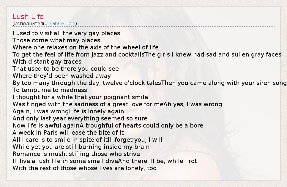 Ill live a lush life in some small diveAnd there Ill be, while I rot
