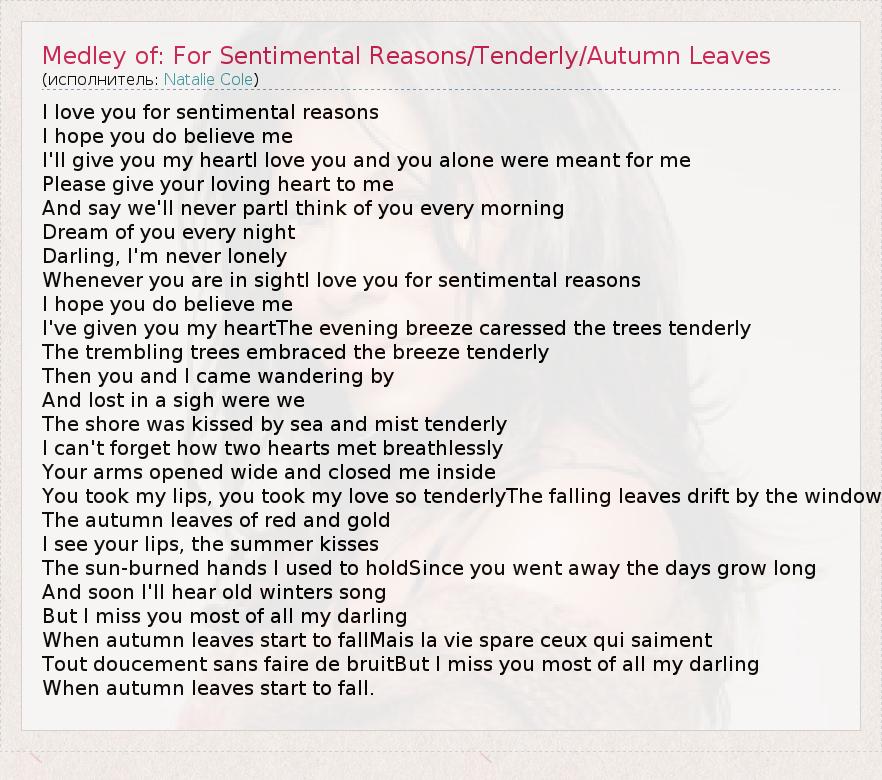 А как ты думаешь, о чем песня "Medley of: For Sentimental Reasons/Tenderly/Autumn Leaves" ?