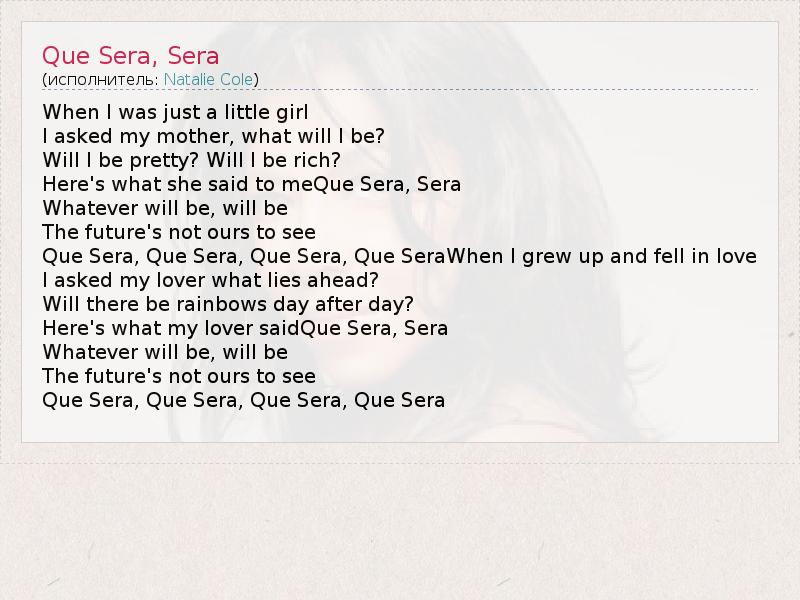 А как ты думаешь, о чем песня "Que Sera, Sera" ?