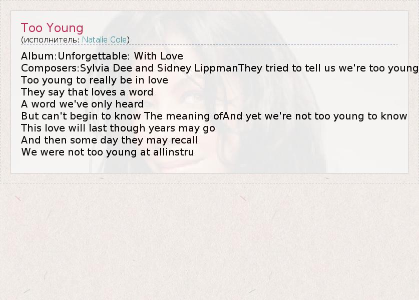 Это интересно:Несмотря на то, что Натали Коул является дочерью знаменитого певца Nat ''King'' Cole, она начала заниматься пением, только после поступления в Университет Штата Массачусетс.Натали начинала свою музыкальную карьеру, с того что писала песни, помимо этого таланта, она была великолепной пианисткой, пела вместе с Chuck Jackson и Marvin Yancy. Их музыка была смесью из различных музыкальных... продолжение