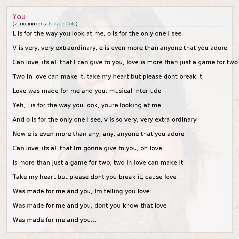 L is for the way you look at me, o is for the only one I see V is very, very extraordinary, e is even more than anyone that you adore Can love, its all that I can give to you, love is more than just a game for two Two in love can make it, take my heart but please dont break it Love was made for me and you, musical interlude Yeh, l is for the way you look, youre looking at me And o is for the only one I see, v is so very, very extra ordinary Now e is even more than any, any, anyone that you adore Can love, its all that Im gonna give to you, oh love Is more than just a game for two, two in love can make it Take my heart but please dont you break it, cause love Was made for me and you, Im telling you love Was made for me and you, dont you know that love Was made for me and you...