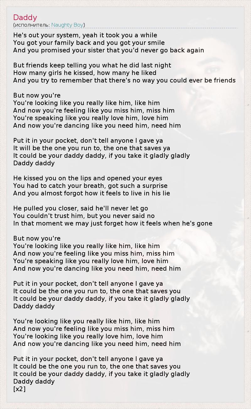 He's out your system, yeah it took you a while You got your family back and you got your smile And you promised your sister that you'd never go back again But friends keep telling you what he did last night How many girls he kissed, how many he liked And you try to remember that there's no way you could ever be friends But now you're You're looking like you really like him, like him And now you're feeling like you miss him, miss him You're speaking like you really love him, love him And now you're dancing like you need him, need him Put it in your pocket, don't tell anyone I gave ya It will be the one you run to, the one that saves ya It could be your daddy daddy, if you take it gladly gladly Daddy daddy He kissed you on the lips and opened your eyes You had to catch your breath, got such a surprise And you almost forgot how it feels to live in his lie He pulled you closer, said he'll never let go You couldn't trust him, but you never said no In that moment we may just forget how it feels when he's gone But now you're You're looking like you really like him, like him And now you're feeling like you miss him, miss him You're speaking like you really love him, love him And now you're dancing like you need him, need him Put it in your pocket, don't tell anyone I gave ya It could be the one you run to, the one that saves you It could be your daddy daddy, if you take it gladly gladly Daddy daddy You're looking like you really like him, like him And now you're feeling like you miss him, miss him You're looking like you really love him, love him And now you're dancing like you need him, need him Put it in your pocket, don't tell anyone I gave ya It could be the one you run to, the one that saves you It could be your daddy daddy, if you take it gladly gladly Daddy daddy [x2]