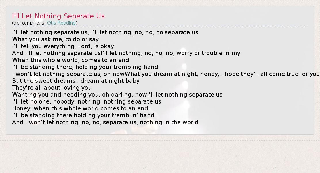 I'll let nothing separate us, I'll let nothing, no, no, no separate us What you ask me, to do or say I'll tell you everything, Lord, is okay And I'll let nothing separate usI'll let nothing, no, no, no, worry or trouble in my When this whole world, comes to an end I'll be standing there, holding your trembling hand I won't let nothing separate us, oh nowWhat you dream at night, honey, I hope they'll all come true for you But the sweet dreams I dream at night baby They're all about loving you Wanting you and needing you, oh darling, nowI'll let nothing separate us I'll let no one, nobody, nothing, nothing separate us Honey, when this whole world comes to an end I'll be standing there holding your tremblin' hand And I won't let nothing, no, no, separate us, nothing in the world