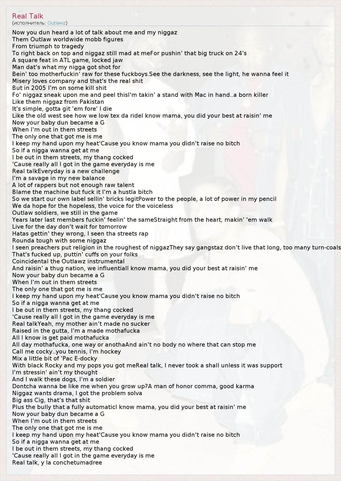 Now you dun heard a lot of talk about me and my niggaz Them Outlaw worldwide mobb figures From triumph to tragedy To right back on top and niggaz still mad at meFor pushin' that big truck on 24's A square feat in ATL game, locked jaw Man dat's what my nigga got shot for Bein' too motherfuckin' raw for these fuckboys.See the darkness, see the light, he wanna feel it Misery loves company and that's the real shit But in 2005 I'm on some kill shit Fo' niggaz sneak upon me and peel thisI'm takin' a stand with Mac in hand..a born killer Like them niggaz from Pakistan It's simple, gotta git 'em fore' I die Like the old west see how we low tex da rideI know mama, you did your best at raisin' me Now your baby dun became a G When I'm out in them streets The only one that got me is me I keep my hand upon my heat'Cause you know mama you didn't raise no bitch So if a nigga wanna get at me I be out in them streets, my thang cocked 'Cause really all I got in the game everyday is me Real talkEveryday is a new challenge I'm a savage in my new balance A lot of rappers but not enough raw talent Blame the machine but fuck it I'm a hustla bitch So we start our own label sellin' bricks legitPower to the people, a lot of power in my pencil We da hope for the hopeless, the voice for the voiceless Outlaw soldiers, we still in the game Years later last members fuckin' feelin' the sameStraight from the heart, makin' 'em walk Live for the day don't wait for tomorrow Hatas gettin' they wrong, I seen tha streets rap Rounda tough with some niggaz I seen preachers put religion in the roughest of niggazThey say gangstaz don't live that long, too many turn-coals That's fucked up, puttin' cuffs on your folks Coincidental the Outlawz instrumental And raisin' a thug nation, we influentialI know mama, you did your best at raisin' me Now your baby dun became a G When I'm out in them streets The only one that got me is me I keep my hand upon my heat'Cause you know mama you didn't raise no bitch So if a nigga wanna get at me I be out in them streets, my thang cocked 'Cause really all I got in the game everyday is me Real talkYeah, my mother ain't made no sucker Raised in the gutta, I'm a made mothafucka All I know is get paid mothafucka All day mothafucka, one way or anothaAnd ain't no body no where that can stop me Call me cocky..you tennis, I'm hockey Mix a little bit of 'Pac E-docky With black Rocky and my pops you got meReal talk, I never took a shall unless it was support I'm stressin' ain't my thought And I walk these dogs, I'm a soldier Dontcha wanna be like me when you grow up?A man of honor comma, good karma Niggaz wants drama, I got the problem solva Big ass Cig, that's that shit Plus the bully that a fully automaticI know mama, you did your best at raisin' me Now your baby dun became a G When I'm out in them streets The only one that got me is me I keep my hand upon my heat'Cause you know mama you didn't raise no bitch So if a nigga wanna get at me I be out in them streets, my thang cocked 'Cause really all I got in the game everyday is me Real talk, y la conchetumadree