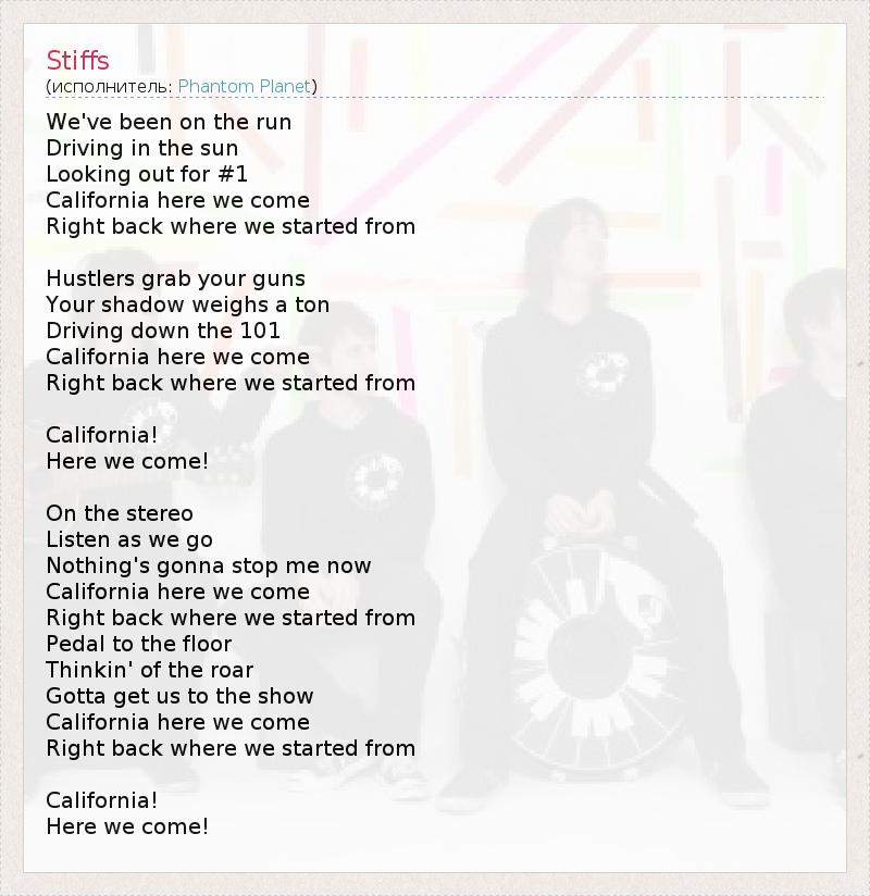 We've been on the run Driving in the sun Looking out for #1 California here we come Right back where we started from Hustlers grab your guns Your shadow weighs a ton Driving down the 101 California here we come Right back where we started from California! Here we come! On the stereo Listen as we go Nothing's gonna stop me now California here we come Right back where we started from Pedal to the floor Thinkin' of the roar Gotta get us to the show California here we come Right back where we started from California! Here we come!