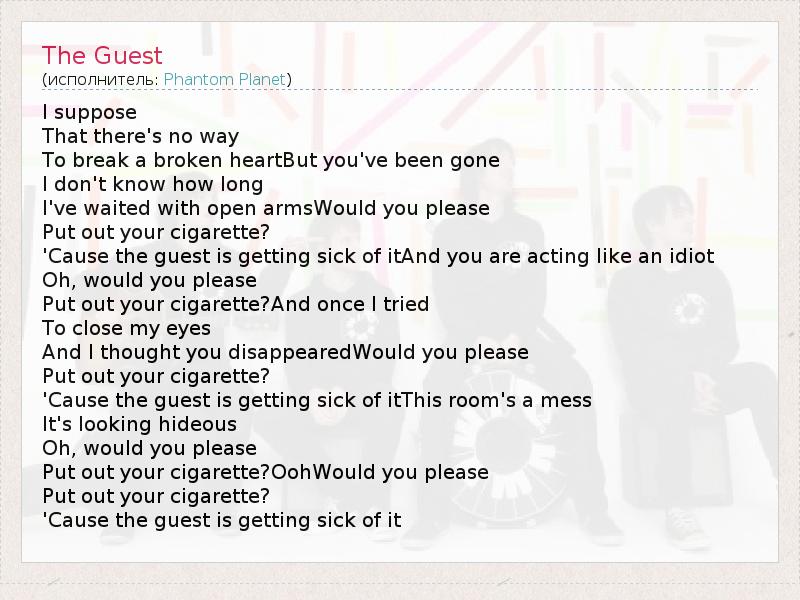 Это интересно:Phantom Planet – группа из Южной Калифорнии, относится к альтернативному року. Группа более широко известна по треку "California", который был создан для популярного молодёжного сериала "The O.C.".Группа существует с 1994 года по наши дни, дебютный альбом появился 1997 году (Phantom Planet is Missing), в 2002 году вышел второй их альбом (The Guest), который принес наибольший успех благодаря песне "California".... продолжение