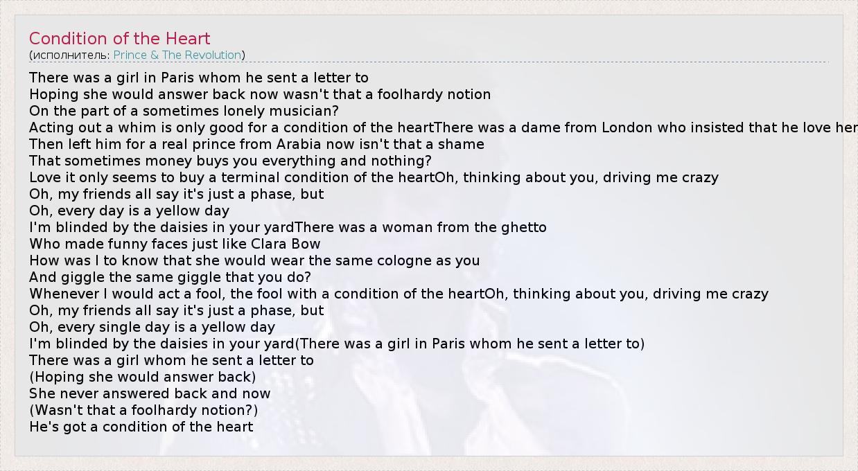 А как ты думаешь, о чем песня "Condition of the Heart" ?