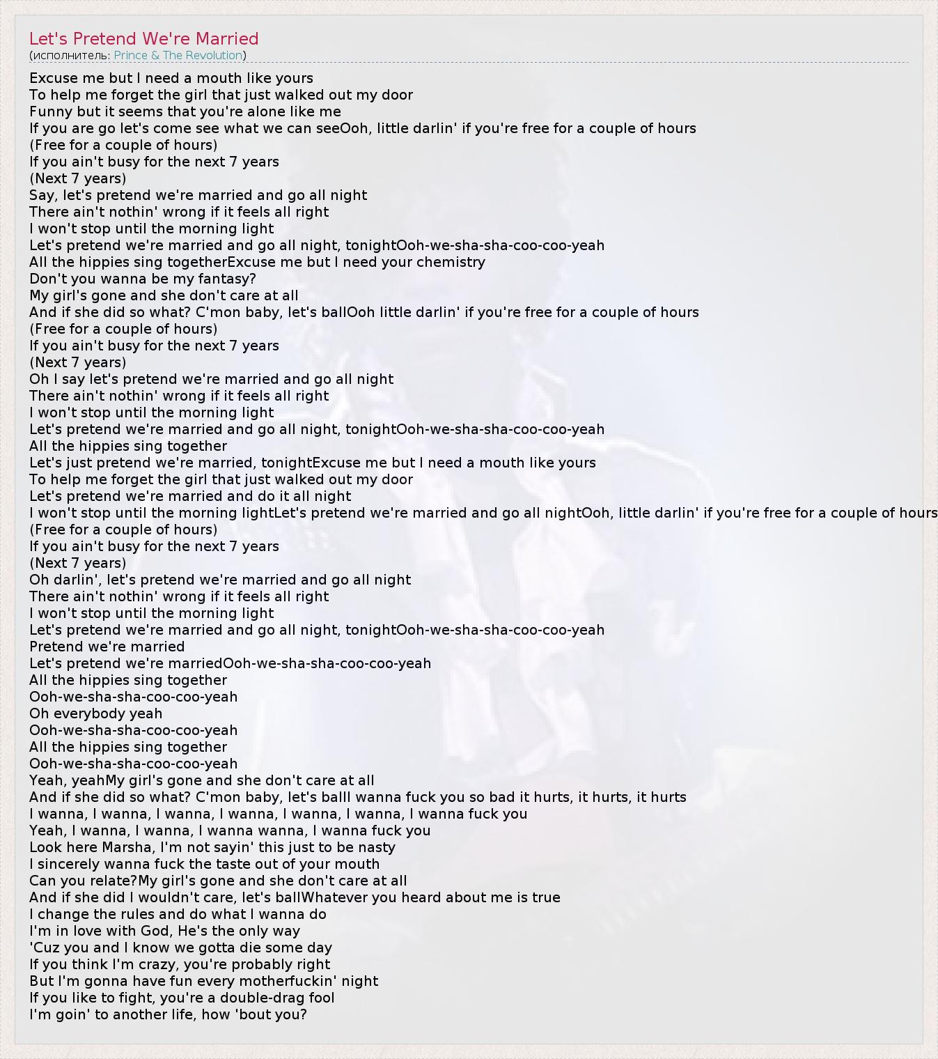 Excuse me but I need a mouth like yours To help me forget the girl that just walked out my door Funny but it seems that you're alone like me If you are go let's come see what we can seeOoh, little darlin' if you're free for a couple of hours (Free for a couple of hours) If you ain't busy for the next 7 years (Next 7 years) Say, let's pretend we're married and go all night There ain't nothin' wrong if it feels all right I won't stop until the morning light Let's pretend we're married and go all night, tonightOoh-we-sha-sha-coo-coo-yeah All the hippies sing togetherExcuse me but I need your chemistry Don't you wanna be my fantasy? My girl's gone and she don't care at all And if she did so what? C'mon baby, let's ballOoh little darlin' if you're free for a couple of hours (Free for a couple of hours) If you ain't busy for the next 7 years (Next 7 years) Oh I say let's pretend we're married and go all night There ain't nothin' wrong if it feels all right I won't stop until the morning light Let's pretend we're married and go all night, tonightOoh-we-sha-sha-coo-coo-yeah All the hippies sing together Let's just pretend we're married, tonightExcuse me but I need a mouth like yours To help me forget the girl that just walked out my door Let's pretend we're married and do it all night I won't stop until the morning lightLet's pretend we're married and go all nightOoh, little darlin' if you're free for a couple of hours (Free for a couple of hours) If you ain't busy for the next 7 years (Next 7 years) Oh darlin', let's pretend we're married and go all night There ain't nothin' wrong if it feels all right I won't stop until the morning light Let's pretend we're married and go all night, tonightOoh-we-sha-sha-coo-coo-yeah Pretend we're married Let's pretend we're marriedOoh-we-sha-sha-coo-coo-yeah All the hippies sing together Ooh-we-sha-sha-coo-coo-yeah Oh everybody yeah Ooh-we-sha-sha-coo-coo-yeah All the hippies sing together Ooh-we-sha-sha-coo-coo-yeah Yeah, yeahMy girl's gone and she don't care at all And if she did so what? C'mon baby, let's ballI wanna fuck you so bad it hurts, it hurts, it hurts I wanna, I wanna, I wanna, I wanna, I wanna, I wanna, I wanna fuck you Yeah, I wanna, I wanna, I wanna wanna, I wanna fuck you Look here Marsha, I'm not sayin' this just to be nasty I sincerely wanna fuck the taste out of your mouth Can you relate?My girl's gone and she don't care at all And if she did I wouldn't care, let's ballWhatever you heard about me is true I change the rules and do what I wanna do I'm in love with God, He's the only way 'Cuz you and I know we gotta die some day If you think I'm crazy, you're probably right But I'm gonna have fun every motherfuckin' night If you like to fight, you're a double-drag fool I'm goin' to another life, how 'bout you?