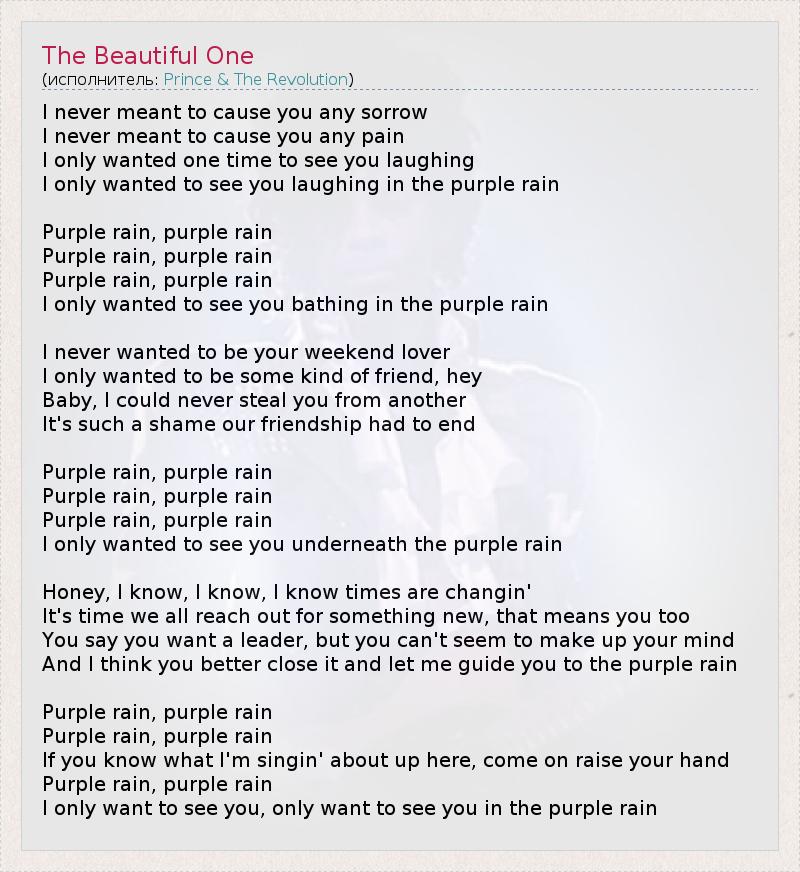 Я никогда не хотел причинять тебе страдания, Я никогда не хотел причинять тебе боль, Я лишь хотел когда-то видеть, как ты смеешься, Я лишь хотел видеть, как ты смеешься под пурпурным дождем. Пурпурный дождь, пурпурный дождь… Пурпурный дождь, пурпурный дождь… Пурпурный дождь, пурпурный дождь… Я лишь хотел видеть, как ты купаешься в пурпурном дожде. Я никогда не хотел быть твоим любовником по выходным, Я лишь хотел быть кем-то вроде друга, хей. Милая, я никогда не украду тебя у другого, Мне очень жаль, что нам пришлось окончить нашу дружбу. Пурпурный дождь, пурпурный дождь… Пурпурный дождь, пурпурный дождь… Пурпурный дождь, пурпурный дождь… Я лишь хотел видеть тебя под пурпурным дождем. Дорогая, я знаю, знаю, знаю, что времена меняются. Пришла пора для всех нас найти что-то новенькое, и для тебя тоже. Ты говоришь, что тебе нужен кто-то, кто будет руководить тобой, но, похоже, не можешь на это решиться. Я думаю, что тебе следует прекратить это и позволить мне проводить тебя под пурпурный дождь. Пурпурный дождь, пурпурный дождь… Пурпурный дождь, пурпурный дождь… Если ты понимаешь, о чем я пою, подними свою руку. Пурпурный дождь, пурпурный дождь… Я лишь хотел видеть тебя, лишь хотел видеть тебя под пурпурным дождем.