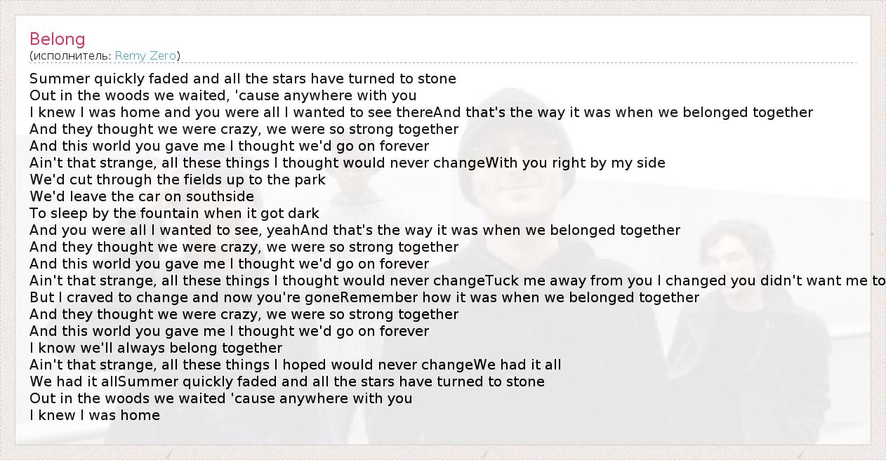 Summer quickly faded and all the stars have turned to stone Out in the woods we waited, 'cause anywhere with you I knew I was home and you were all I wanted to see thereAnd that's the way it was when we belonged together And they thought we were crazy, we were so strong together And this world you gave me I thought we'd go on forever Ain't that strange, all these things I thought would never changeWith you right by my side We'd cut through the fields up to the park We'd leave the car on southside To sleep by the fountain when it got dark And you were all I wanted to see, yeahAnd that's the way it was when we belonged together And they thought we were crazy, we were so strong together And this world you gave me I thought we'd go on forever Ain't that strange, all these things I thought would never changeTuck me away from you I changed you didn't want me to But I craved to change and now you're goneRemember how it was when we belonged together And they thought we were crazy, we were so strong together And this world you gave me I thought we'd go on forever I know we'll always belong together Ain't that strange, all these things I hoped would never changeWe had it all We had it allSummer quickly faded and all the stars have turned to stone Out in the woods we waited 'cause anywhere with you I knew I was home