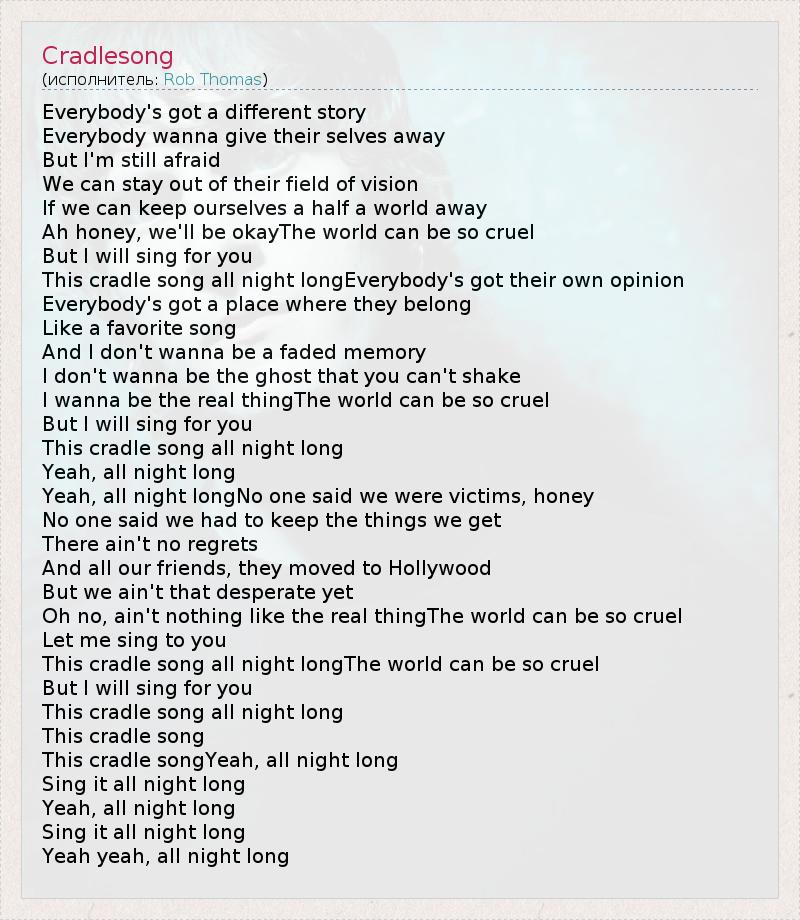 Everybody's got a different story Everybody wanna give their selves away But I'm still afraid We can stay out of their field of vision If we can keep ourselves a half a world away Ah honey, we'll be okayThe world can be so cruel But I will sing for you This cradle song all night longEverybody's got their own opinion Everybody's got a place where they belong Like a favorite song And I don't wanna be a faded memory I don't wanna be the ghost that you can't shake I wanna be the real thingThe world can be so cruel But I will sing for you This cradle song all night long Yeah, all night long Yeah, all night longNo one said we were victims, honey No one said we had to keep the things we get There ain't no regrets And all our friends, they moved to Hollywood But we ain't that desperate yet Oh no, ain't nothing like the real thingThe world can be so cruel Let me sing to you This cradle song all night longThe world can be so cruel But I will sing for you This cradle song all night long This cradle song This cradle songYeah, all night long Sing it all night long Yeah, all night long Sing it all night long Yeah yeah, all night long