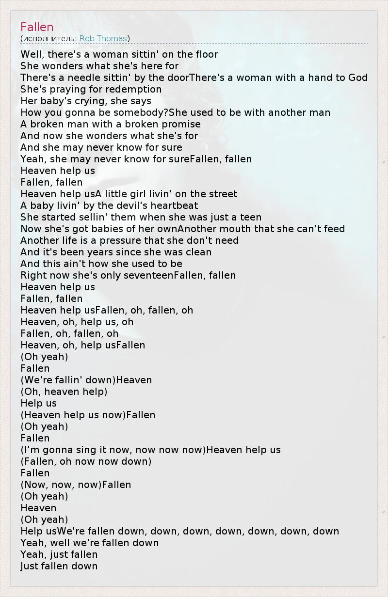Well, there's a woman sittin' on the floor She wonders what she's here for There's a needle sittin' by the doorThere's a woman with a hand to God She's praying for redemption Her baby's crying, she says How you gonna be somebody?She used to be with another man A broken man with a broken promise And now she wonders what she's for And she may never know for sure Yeah, she may never know for sureFallen, fallen Heaven help us Fallen, fallen Heaven help usA little girl livin' on the street A baby livin' by the devil's heartbeat She started sellin' them when she was just a teen Now she's got babies of her ownAnother mouth that she can't feed Another life is a pressure that she don't need And it's been years since she was clean And this ain't how she used to be Right now she's only seventeenFallen, fallen Heaven help us Fallen, fallen Heaven help usFallen, oh, fallen, oh Heaven, oh, help us, oh Fallen, oh, fallen, oh Heaven, oh, help usFallen (Oh yeah) Fallen (We're fallin' down)Heaven (Oh, heaven help) Help us (Heaven help us now)Fallen (Oh yeah) Fallen (I'm gonna sing it now, now now now)Heaven help us (Fallen, oh now now down) Fallen (Now, now, now)Fallen (Oh yeah) Heaven (Oh yeah) Help usWe're fallen down, down, down, down, down, down, down Yeah, well we're fallen down Yeah, just fallen Just fallen down