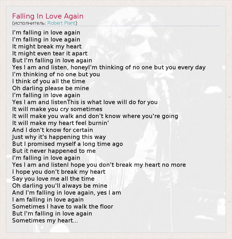 I'm falling in love again I'm falling in love again It might break my heart It might even tear it apart But I'm falling in love again Yes I am and listen, honeyI'm thinking of no one but you every day I'm thinking of no one but you I think of you all the time Oh darling please be mine I'm falling in love again Yes I am and listenThis is what love will do for you It will make you cry sometimes It will make you walk and don't know where you're going It will make my heart feel burnin' And I don't know for certain Just why it's happening this way But I promised myself a long time ago But it never happened to me I'm falling in love again Yes I am and listenI hope you don't break my heart no more I hope you don't break my heart Say you love me all the time Oh darling you'll always be mine And I'm falling in love again, yes I am I am falling in love again Sometimes I have to walk the floor But I'm falling in love again Sometimes my heart...