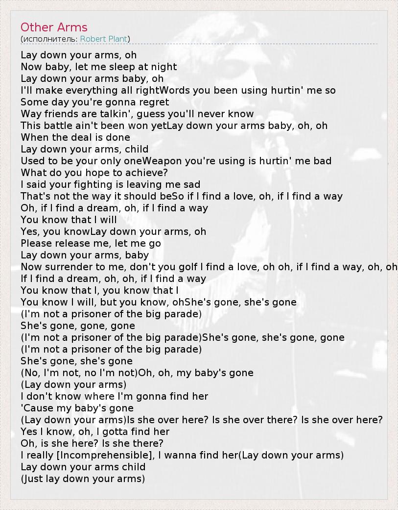 Lay down your arms, oh Now baby, let me sleep at night Lay down your arms baby, oh I'll make everything all rightWords you been using hurtin' me so Some day you're gonna regret Way friends are talkin', guess you'll never know This battle ain't been won yetLay down your arms baby, oh, oh When the deal is done Lay down your arms, child Used to be your only oneWeapon you're using is hurtin' me bad What do you hope to achieve? I said your fighting is leaving me sad That's not the way it should beSo if I find a love, oh, if I find a way Oh, if I find a dream, oh, if I find a way You know that I will Yes, you knowLay down your arms, oh Please release me, let me go Lay down your arms, baby Now surrender to me, don't you goIf I find a love, oh oh, if I find a way, oh, oh If I find a dream, oh, oh, if I find a way You know that I, you know that I You know I will, but you know, ohShe's gone, she's gone (I'm not a prisoner of the big parade) She's gone, gone, gone (I'm not a prisoner of the big parade)She's gone, she's gone, gone (I'm not a prisoner of the big parade) She's gone, she's gone (No, I'm not, no I'm not)Oh, oh, my baby's gone (Lay down your arms) I don't know where I'm gonna find her 'Cause my baby's gone (Lay down your arms)Is she over here? Is she over there? Is she over here? Yes I know, oh, I gotta find her Oh, is she here? Is she there? I really [Incomprehensible], I wanna find her(Lay down your arms) Lay down your arms child (Just lay down your arms)