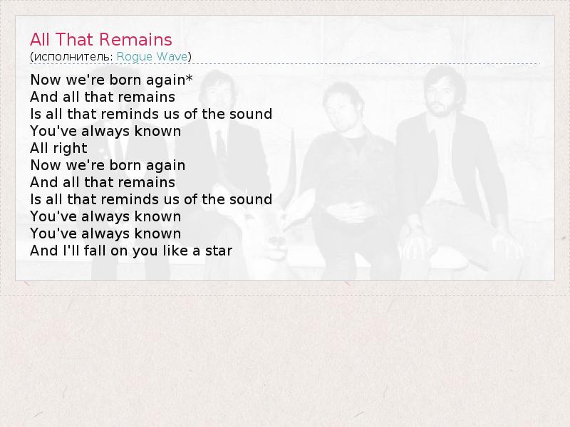 Это интересно:Инди-поп группа «Rogue Wave» была создана в 2002 году Заком Рогом. В 2004 году группа выпустила дебютный альбом «Out Of The Shadow» и «Descended Like Vultures» в 2005. Четырёх парней из Калифорнии часто сравнивают с The Shins. Певец и композитор Джек Джонсон был впечатлён творчеством Rogue Wave. В 2007 году его звукозаписывающая компания Brushfire Records заключила контракт с группой и в этом же году выпустила альбом «Asleep At Heavens Gate».... продолжение