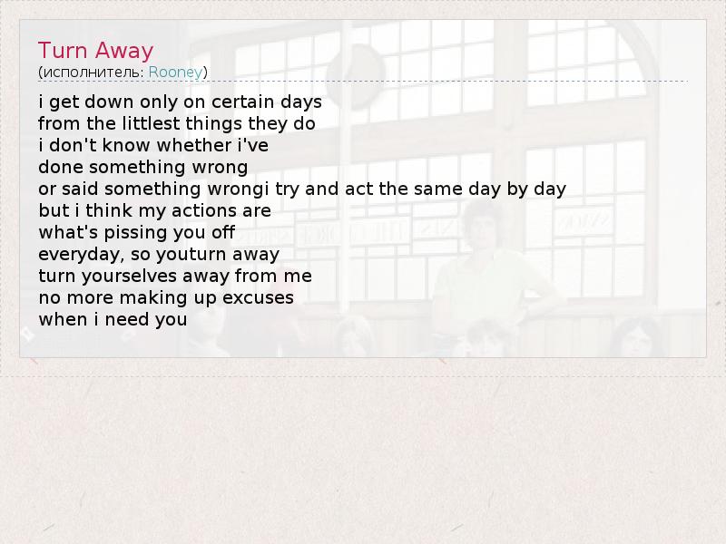 Это интересно:Rooney - американская рок-группа родом из Лос-Анджелеса. Название группы, которая записывается на лейбле Geffen, является фамилией одного из персонажей фильма "Феррис Бьюллер берёт выходной" Эда Руни, которого играет Джефри Джонс. Их музыкальный стиль - это отголоски той музыки, что звучала последние сорок лет, их часто сравнивают с Beatles, The Cars или Blur. На них оказали влияние The Kinks,... продолжение
