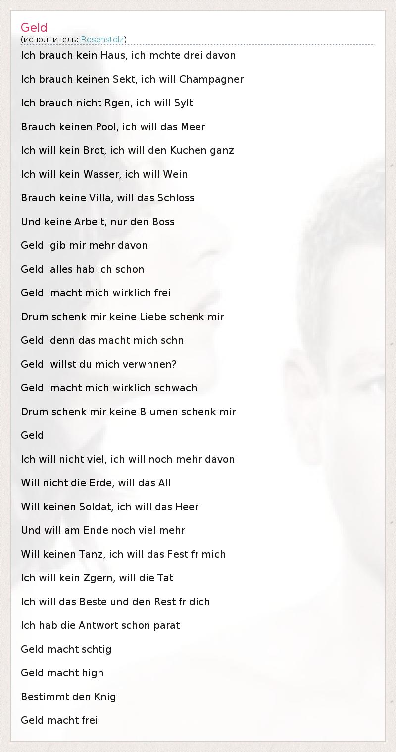 Это интересно:Rosenstolz (Розэнштольц) - музыкальный дуэт из Берлина, состоящий из вокалистки АнНы Р. (AnNa R.) и вокалиста Петера Плате (Peter Plate). Группа была основана в 1991 году в районе Берлин-Фридрихсхайн (Berlin-Friedrichshain). Песни, почти всегда на немецком языке, можно отнести к пересечению таких стилей, как поп, шансон и рок. Особенно в начале карьеры тексты группы были многозначными. В начале-середине девяностых... продолжение