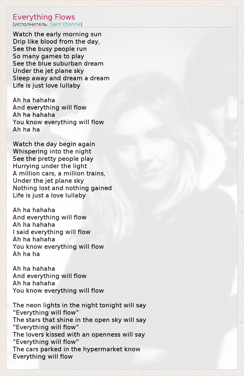 Watch the early morning sun Drip like blood from the day, See the busy people run So many games to play See the blue suburban dream Under the jet plane sky Sleep away and dream a dream Life is just love lullaby Ah ha hahaha And everything will flow Ah ha hahaha You know everything will flow Ah ha ha Watch the day begin again Whispering into the night See the pretty people play Hurrying under the light A million cars, a million trains, Under the jet plane sky Nothing lost and nothing gained Life is just a love lullaby Ah ha hahaha And everything will flow Ah ha hahaha I said everything will flow Ah ha hahaha You know everything will flow Ah ha ha Ah ha hahaha And everything will flow Ah ha hahaha You know everything will flow The neon lights in the night tonight will say "Everything will flow" The stars that shine in the open sky will say "Everything will flow" The lovers kissed with an openness will say "Everything will flow" The cars parked in the hypermarket know Everything will flow