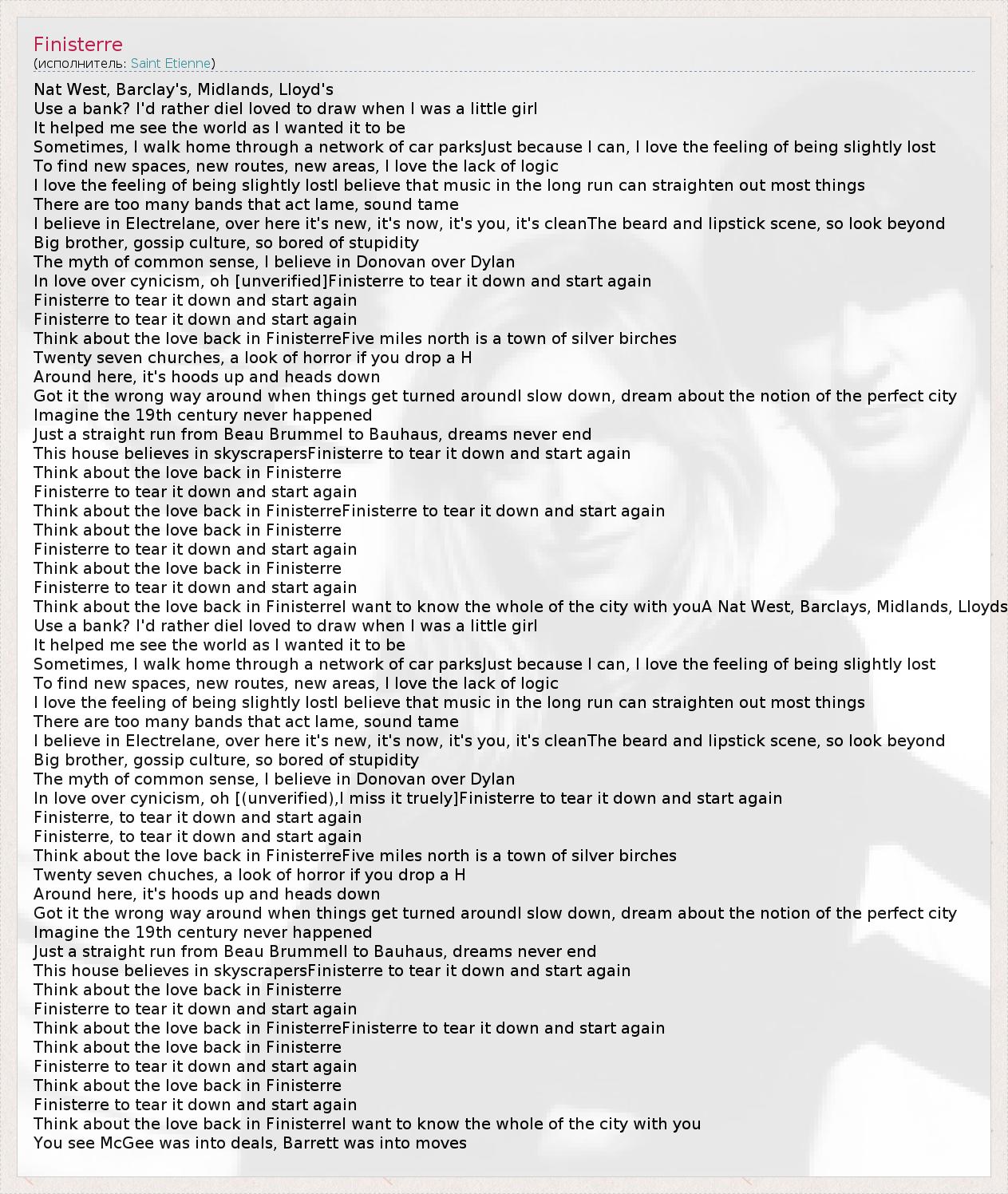 Nat West, Barclay's, Midlands, Lloyd's Use a bank? I'd rather dieI loved to draw when I was a little girl It helped me see the world as I wanted it to be Sometimes, I walk home through a network of car parksJust because I can, I love the feeling of being slightly lost To find new spaces, new routes, new areas, I love the lack of logic I love the feeling of being slightly lostI believe that music in the long run can straighten out most things There are too many bands that act lame, sound tame I believe in Electrelane, over here it's new, it's now, it's you, it's cleanThe beard and lipstick scene, so look beyond Big brother, gossip culture, so bored of stupidity The myth of common sense, I believe in Donovan over Dylan In love over cynicism, oh [unverified]Finisterre to tear it down and start again Finisterre to tear it down and start again Finisterre to tear it down and start again Think about the love back in FinisterreFive miles north is a town of silver birches Twenty seven churches, a look of horror if you drop a H Around here, it's hoods up and heads down Got it the wrong way around when things get turned aroundI slow down, dream about the notion of the perfect city Imagine the 19th century never happened Just a straight run from Beau Brummel to Bauhaus, dreams never end This house believes in skyscrapersFinisterre to tear it down and start again Think about the love back in Finisterre Finisterre to tear it down and start again Think about the love back in FinisterreFinisterre to tear it down and start again Think about the love back in Finisterre Finisterre to tear it down and start again Think about the love back in Finisterre Finisterre to tear it down and start again Think about the love back in FinisterreI want to know the whole of the city with youA Nat West, Barclays, Midlands, Lloyds Use a bank? I'd rather dieI loved to draw when I was a little girl It helped me see the world as I wanted it to be Sometimes, I walk home through a network of car parksJust because I can, I love the feeling of being slightly lost To find new spaces, new routes, new areas, I love the lack of logic I love the feeling of being slightly lostI believe that music in the long run can straighten out most things There are too many bands that act lame, sound tame I believe in Electrelane, over here it's new, it's now, it's you, it's cleanThe beard and lipstick scene, so look beyond Big brother, gossip culture, so bored of stupidity The myth of common sense, I believe in Donovan over Dylan In love over cynicism, oh [(unverified),I miss it truely]Finisterre to tear it down and start again Finisterre, to tear it down and start again Finisterre, to tear it down and start again Think about the love back in FinisterreFive miles north is a town of silver birches Twenty seven chuches, a look of horror if you drop a H Around here, it's hoods up and heads down Got it the wrong way around when things get turned aroundI slow down, dream about the notion of the perfect city Imagine the 19th century never happened Just a straight run from Beau Brummell to Bauhaus, dreams never end This house believes in skyscrapersFinisterre to tear it down and start again Think about the love back in Finisterre Finisterre to tear it down and start again Think about the love back in FinisterreFinisterre to tear it down and start again Think about the love back in Finisterre Finisterre to tear it down and start again Think about the love back in Finisterre Finisterre to tear it down and start again Think about the love back in FinisterreI want to know the whole of the city with you You see McGee was into deals, Barrett was into moves