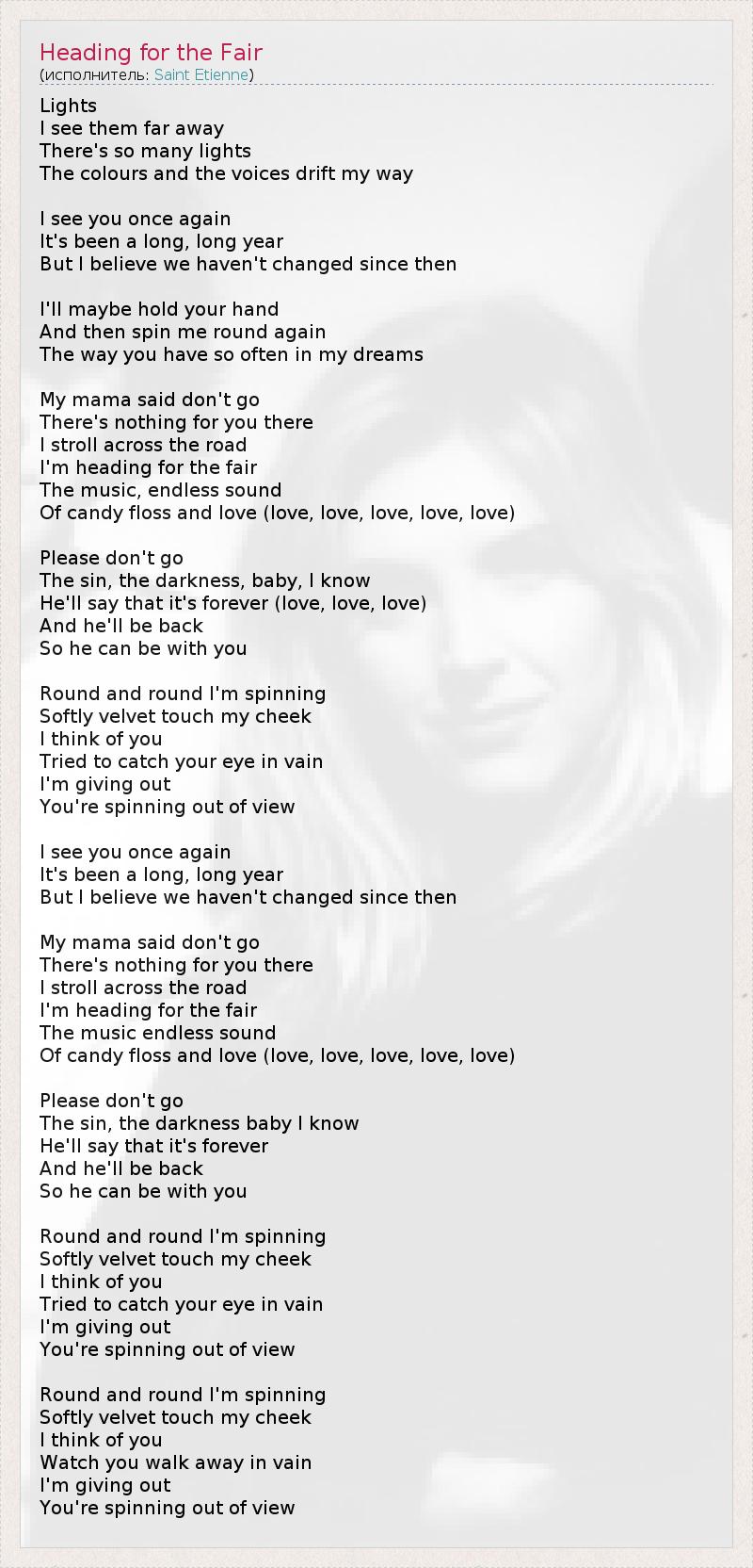 Lights I see them far away There's so many lights The colours and the voices drift my way I see you once again It's been a long, long year But I believe we haven't changed since then I'll maybe hold your hand And then spin me round again The way you have so often in my dreams My mama said don't go There's nothing for you there I stroll across the road I'm heading for the fair The music, endless sound Of candy floss and love (love, love, love, love, love) Please don't go The sin, the darkness, baby, I know He'll say that it's forever (love, love, love) And he'll be back So he can be with you Round and round I'm spinning Softly velvet touch my cheek I think of you Tried to catch your eye in vain I'm giving out You're spinning out of view I see you once again It's been a long, long year But I believe we haven't changed since then My mama said don't go There's nothing for you there I stroll across the road I'm heading for the fair The music endless sound Of candy floss and love (love, love, love, love, love) Please don't go The sin, the darkness baby I know He'll say that it's forever And he'll be back So he can be with you Round and round I'm spinning Softly velvet touch my cheek I think of you Tried to catch your eye in vain I'm giving out You're spinning out of view Round and round I'm spinning Softly velvet touch my cheek I think of you Watch you walk away in vain I'm giving out You're spinning out of view