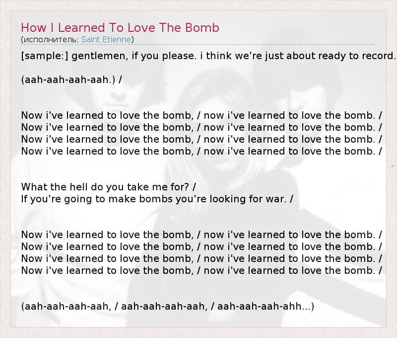 [sample:] gentlemen, if you please. i think we're just about ready to record. (aah-aah-aah-aah.) / Now i've learned to love the bomb, / now i've learned to love the bomb. / Now i've learned to love the bomb, / now i've learned to love the bomb. / Now i've learned to love the bomb, / now i've learned to love the bomb. / Now i've learned to love the bomb, / now i've learned to love the bomb. / What the hell do you take me for? / If you're going to make bombs you're looking for war. / Now i've learned to love the bomb, / now i've learned to love the bomb. / Now i've learned to love the bomb, / now i've learned to love the bomb. / Now i've learned to love the bomb, / now i've learned to love the bomb. / Now i've learned to love the bomb, / now i've learned to love the bomb. / (aah-aah-aah-aah, / aah-aah-aah-aah, / aah-aah-aah-ahh...)
