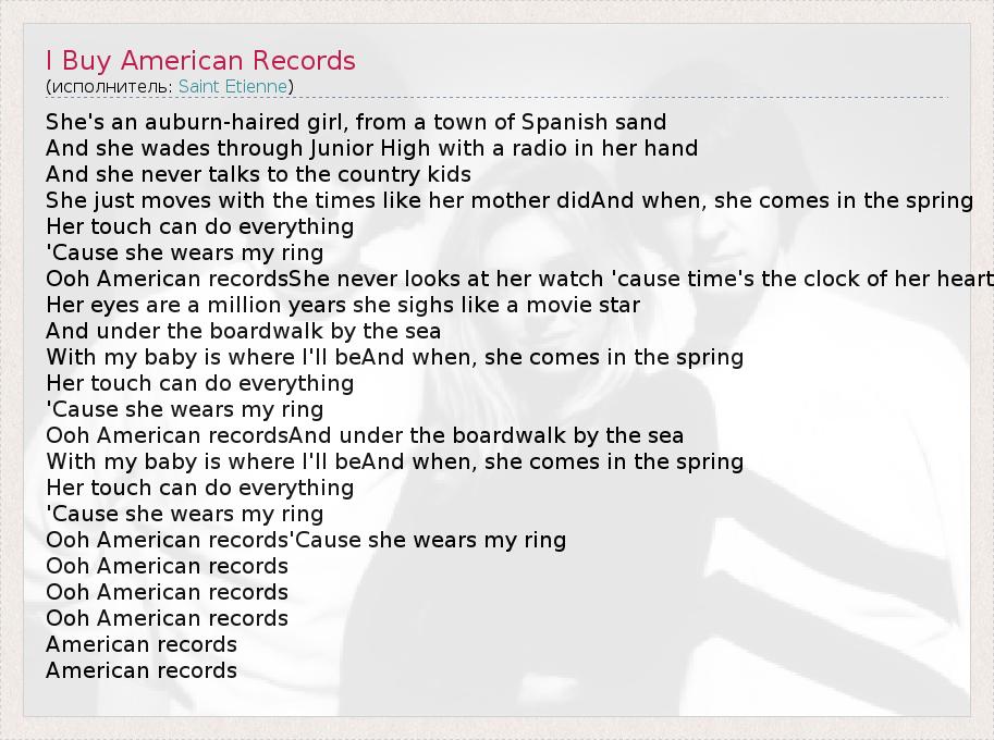 She's an auburn-haired girl, from a town of Spanish sand And she wades through Junior High with a radio in her hand And she never talks to the country kids She just moves with the times like her mother didAnd when, she comes in the spring Her touch can do everything 'Cause she wears my ring Ooh American recordsShe never looks at her watch 'cause time's the clock of her heart Her eyes are a million years she sighs like a movie star And under the boardwalk by the sea With my baby is where I'll beAnd when, she comes in the spring Her touch can do everything 'Cause she wears my ring Ooh American recordsAnd under the boardwalk by the sea With my baby is where I'll beAnd when, she comes in the spring Her touch can do everything 'Cause she wears my ring Ooh American records'Cause she wears my ring Ooh American records Ooh American records Ooh American records American records American records
