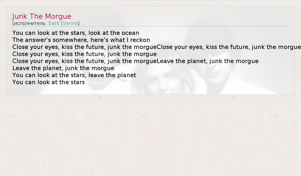 Это интересно:Трудно представить историю британской поп-музыки без «Saint Etienne». Их удивительная способность выпускать пластинки с настроением «шестидесятых» стала главной отличительной чертой группы. Вот уже десять лет «Saint Etienne» по праву занимают место самой стильной группы в Англии. «Музыка дизайнеров и арт-директоров» - такое определение «Saint Etienne» получили из уст одного журналиста. И действительно,... продолжение