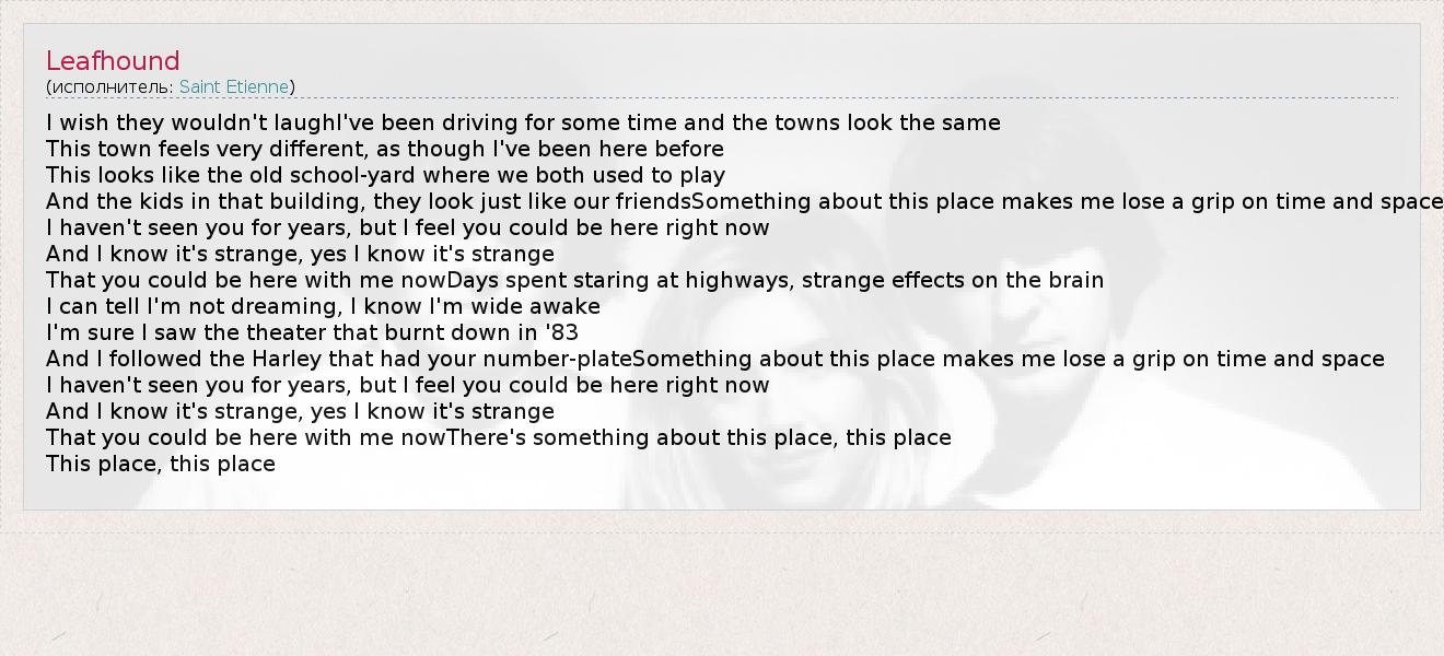Это интересно:Трудно представить историю британской поп-музыки без «Saint Etienne». Их удивительная способность выпускать пластинки с настроением «шестидесятых» стала главной отличительной чертой группы. Вот уже десять лет «Saint Etienne» по праву занимают место самой стильной группы в Англии. «Музыка дизайнеров и арт-директоров» - такое определение «Saint Etienne» получили из уст одного журналиста. И действительно,... продолжение