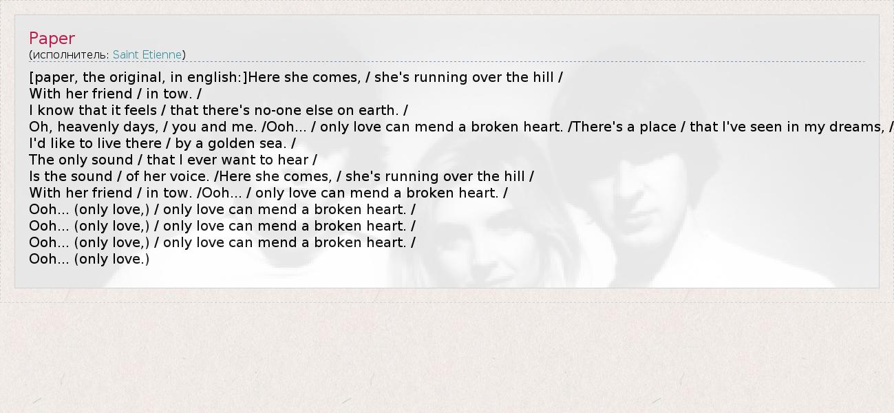 [paper, the original, in english:]Here she comes, / she's running over the hill / With her friend / in tow. / I know that it feels / that there's no-one else on earth. / Oh, heavenly days, / you and me. /Ooh... / only love can mend a broken heart. /There's a place / that I've seen in my dreams, / I'd like to live there / by a golden sea. / The only sound / that I ever want to hear / Is the sound / of her voice. /Here she comes, / she's running over the hill / With her friend / in tow. /Ooh... / only love can mend a broken heart. / Ooh... (only love,) / only love can mend a broken heart. / Ooh... (only love,) / only love can mend a broken heart. / Ooh... (only love,) / only love can mend a broken heart. / Ooh... (only love.)