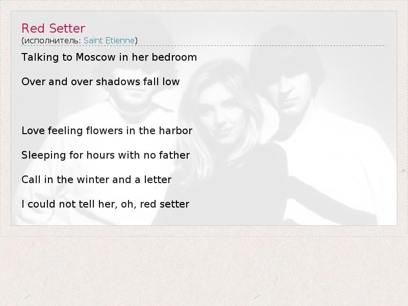 Это интересно:Трудно представить историю британской поп-музыки без «Saint Etienne». Их удивительная способность выпускать пластинки с настроением «шестидесятых» стала главной отличительной чертой группы. Вот уже десять лет «Saint Etienne» по праву занимают место самой стильной группы в Англии. «Музыка дизайнеров и арт-директоров» - такое определение «Saint Etienne» получили из уст одного журналиста. И действительно,... продолжение