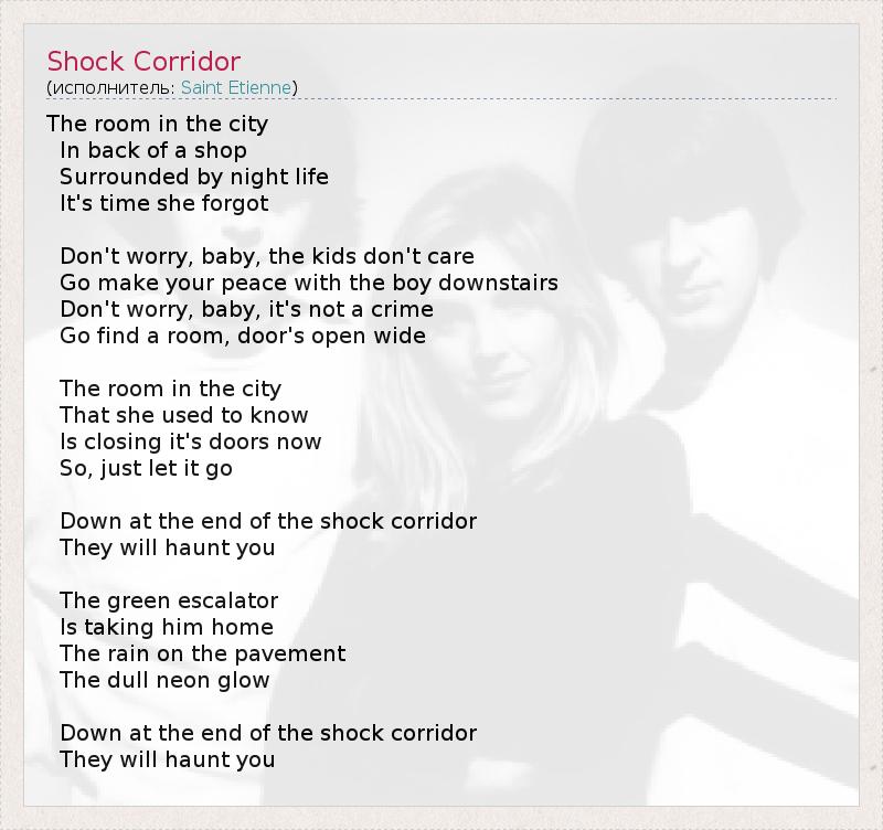 The room in the city In back of a shop Surrounded by night life It's time she forgot Don't worry, baby, the kids don't care Go make your peace with the boy downstairs Don't worry, baby, it's not a crime Go find a room, door's open wide The room in the city That she used to know Is closing it's doors now So, just let it go Down at the end of the shock corridor They will haunt you The green escalator Is taking him home The rain on the pavement The dull neon glow Down at the end of the shock corridor They will haunt you