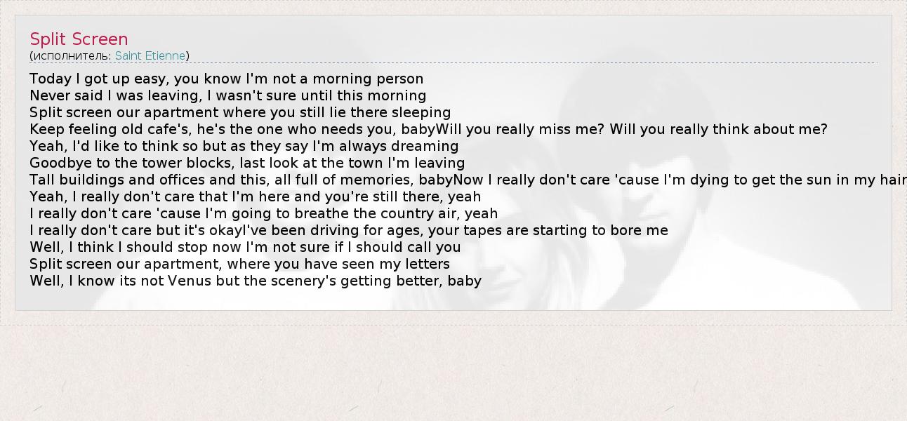 Это интересно:Трудно представить историю британской поп-музыки без «Saint Etienne». Их удивительная способность выпускать пластинки с настроением «шестидесятых» стала главной отличительной чертой группы. Вот уже десять лет «Saint Etienne» по праву занимают место самой стильной группы в Англии. «Музыка дизайнеров и арт-директоров» - такое определение «Saint Etienne» получили из уст одного журналиста. И действительно,... продолжение