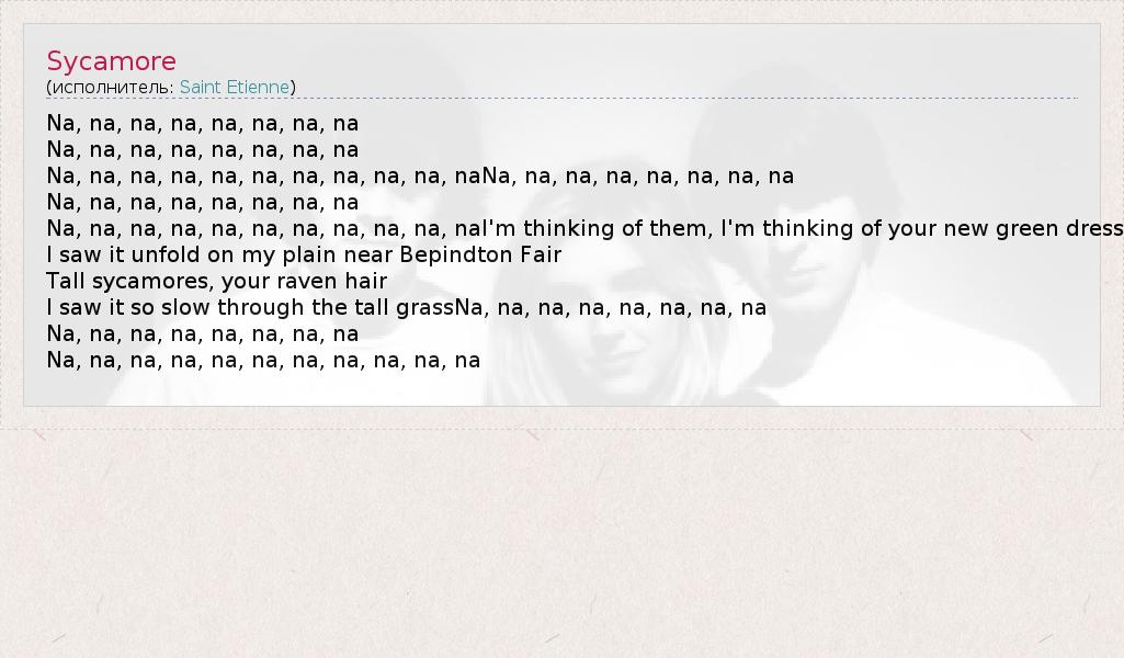 Это интересно:Трудно представить историю британской поп-музыки без «Saint Etienne». Их удивительная способность выпускать пластинки с настроением «шестидесятых» стала главной отличительной чертой группы. Вот уже десять лет «Saint Etienne» по праву занимают место самой стильной группы в Англии. «Музыка дизайнеров и арт-директоров» - такое определение «Saint Etienne» получили из уст одного журналиста. И действительно,... продолжение