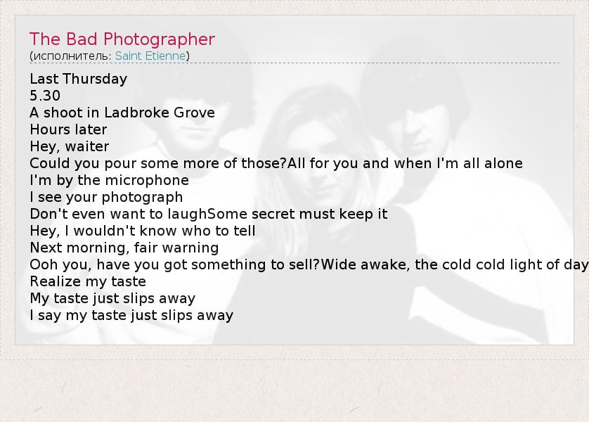 А как ты думаешь, о чем песня "The Bad Photographer" ?