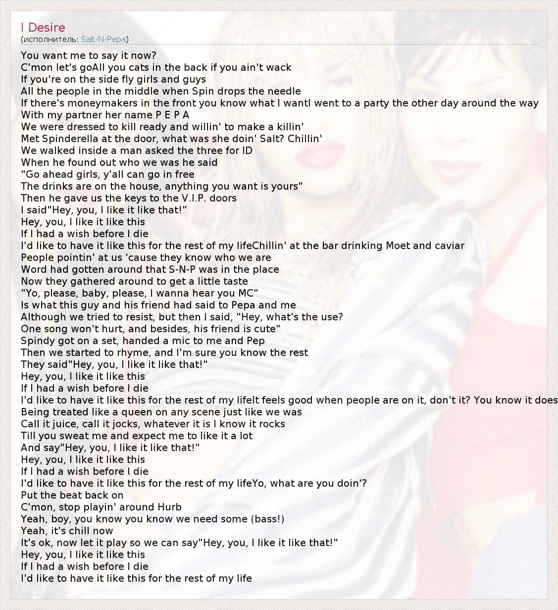 You want me to say it now? C'mon let's goAll you cats in the back if you ain't wack If you're on the side fly girls and guys All the people in the middle when Spin drops the needle If there's moneymakers in the front you know what I wantI went to a party the other day around the way With my partner her name P E P A We were dressed to kill ready and willin' to make a killin' Met Spinderella at the door, what was she doin' Salt? Chillin' We walked inside a man asked the three for ID When he found out who we was he said "Go ahead girls, y'all can go in free The drinks are on the house, anything you want is yours" Then he gave us the keys to the V.I.P. doors I said"Hey, you, I like it like that!" Hey, you, I like it like this If I had a wish before I die I'd like to have it like this for the rest of my lifeChillin' at the bar drinking Moet and caviar People pointin' at us 'cause they know who we are Word had gotten around that S-N-P was in the place Now they gathered around to get a little taste "Yo, please, baby, please, I wanna hear you MC" Is what this guy and his friend had said to Pepa and me Although we tried to resist, but then I said, "Hey, what's the use? One song won't hurt, and besides, his friend is cute" Spindy got on a set, handed a mic to me and Pep Then we started to rhyme, and I'm sure you know the rest They said"Hey, you, I like it like that!" Hey, you, I like it like this If I had a wish before I die I'd like to have it like this for the rest of my lifeIt feels good when people are on it, don't it? You know it does Being treated like a queen on any scene just like we was Call it juice, call it jocks, whatever it is I know it rocks Till you sweat me and expect me to like it a lot And say"Hey, you, I like it like that!" Hey, you, I like it like this If I had a wish before I die I'd like to have it like this for the rest of my lifeYo, what are you doin'? Put the beat back on C'mon, stop playin' around Hurb Yeah, boy, you know you know we need some (bass!) Yeah, it's chill now It's ok, now let it play so we can say"Hey, you, I like it like that!" Hey, you, I like it like this If I had a wish before I die I'd like to have it like this for the rest of my life