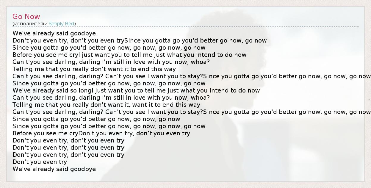 Don't you even try, don't you even trySince you gotta go you'd better go now, go now